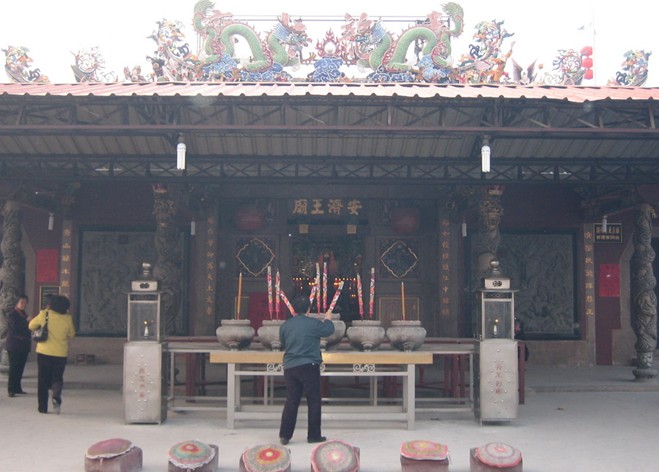 由于船和鳳凰塔都能在廟前看到,故人們印象深刻而傳誦一時,此聯(lián)為惠來舉人卓晏春(1839至1890年)所撰。廟正門兩邊的旁門較小,門上石匾分別刻著“崇德”和“翼疆”,小門也有門聯(lián),但因沒有卓晏春撰的精采和實際而被遺忘了。廟內(nèi)的安濟(jì)圣王像披有黃色繡金線龍袍戴著皇冠,金身高達(dá)八尺,由堅硬楠木刻成。但不是施所學(xué)從云南帶來的小神像,那小神像先前放在南門謝氏宗祠。據(jù)說至今保存完好。廟中圣王像要比兩邊的大夫人和二夫人像大得好多,以示威武神圣。