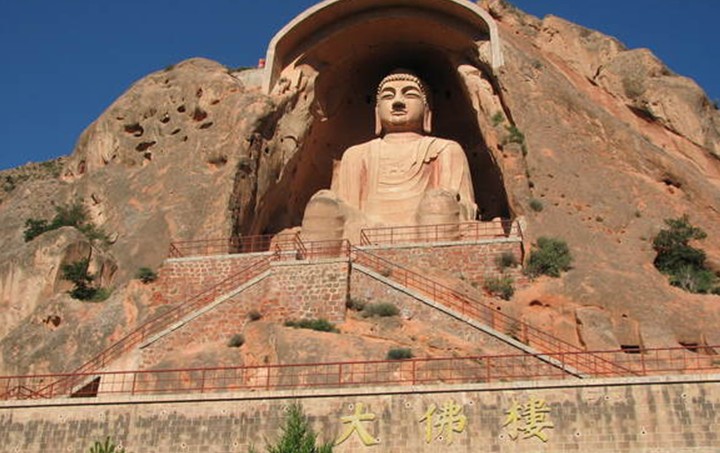 最為引人注目的,是須彌山入口處高達20.6米的彌勒大座佛。它高坐于唐代大中三年(849年)開鑿的一個馬蹄形石窟內,身披袈裟,頭流螺髻;臉如滿月,雙耳垂肩,神情莊重,十分壯觀。這座大佛比云崗石窟中最大的十九窟坐佛和龍門石窟的奉先寺盧舍那佛還高,是全國最大的造像之一。走近觀察,只見那佛高大魁梧,足有五六層樓高,耳朵有兩人高,眼窩直徑1米多,佛雖大,但雕刻卻十分的精致。專家說,這完全是一塊完整的罕見巨石雕琢出來的,充分顯示了中國古代工匠的高超技藝和雄偉氣魄。唐代統(tǒng)治者提倡佛教,武則天曾下令全國各州建大佛寺,造大佛像。有學者推測,這等大佛可能是在武則天掀起的崇拜佛的浪潮中建造的。站在大佛的腳下,眼前似有云霧繚繞,耳旁隱聽山泉叮咚,山石霧松組成大西北黃土高原上獨特的山水畫卷