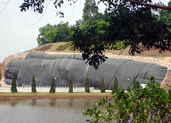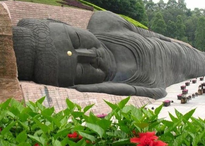 大臥佛位于森林公園天仙巖。相傳當年佛教大師六祖惠能傳教后深夜經(jīng)過這里,看到天仙巖靈光閃爍,隱約可見這塊橫臥的大石塊就是一個大臥佛,六祖立即跪拜,求佛祖降福天下。大臥佛的雕造從這個傳說獲取靈感,以盛唐敦煌臥佛為范本,佛身長108米,尺度堪稱世界之最?,F(xiàn)經(jīng)改造用紫銅包裝大臥佛,成為金裝大臥佛。大佛前面是錦鯉池和荷花池,與大佛相互映襯引人入勝。大佛對岸一層為長六十米的長廊,廊內(nèi)彩繪佛傳故事,二層為敬佛臺,憑欄對拜,大佛全景一覽無遺。