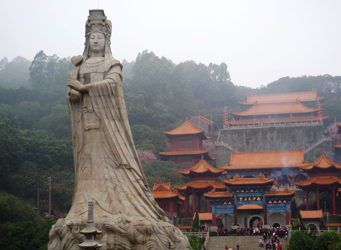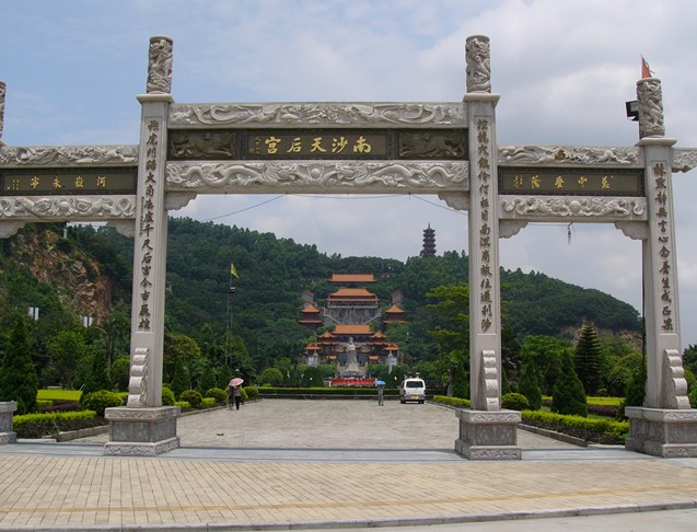 南沙天后宮,緊臨珠江出海口伶仃洋,坐落于大角山東南麓,依山傍水,其建筑依山勢層疊而上,殿宇輝煌,樓閣雄偉,在天后廣場正中就是石雕天后圣像,是為紀念海上女神林默而建,建筑特點是集北京故宮的風格和南京中山陵的氣勢于一體,其規模是現今世界同類建筑之最,被譽為“天下天后第一宮”,也是東南亞最大的媽祖廟。天后圣像高達14.5 米,屹立在天后宮廣場正中。整座天后宮四周綠樹婆娑,殿中香煙裊裊,置身其間令人頓生超凡脫俗的感覺。