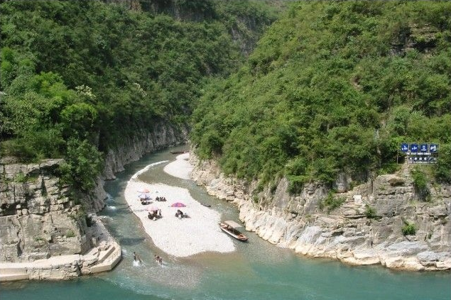 長(zhǎng)灘峽:自雙河至平河,全長(zhǎng)5公里。峽中有一段長(zhǎng)約2公里的河灘,寬十余米,筆直一線,水平如鏡,沙石潔白,兩岸山水掩映,故名長(zhǎng)灘峽。峽內(nèi)谷窄山高,絕壁對(duì)峙,氣勢(shì)雄險(xiǎn);水清見(jiàn)底,水中游弋品種繁多的魚(yú)類;沿岸多有色彩斑斕的卵石,時(shí)或見(jiàn)古生物化石。峽內(nèi)有滴水巖、聰明泉、手爬巖、穿洞子等景致。