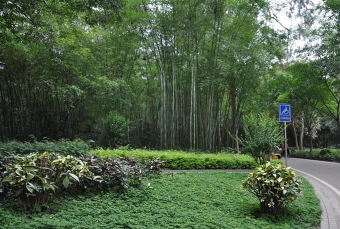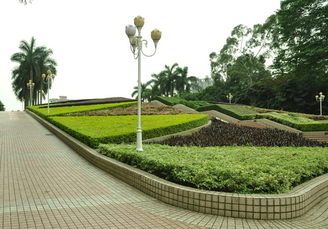 公園環境舒適,草坪舒展,山丘起伏,林木蒼翠,湖波粼粼,好一派自然清新的郊野風情。氣勢宏偉的南北大門景色,門前廣場橫跨寬度達 100 米,建筑風格獨特,植物色彩配置艷麗,布置緊湊,頗有現代公園氣派。最為壯觀的南門中軸廣場,兩側種植風景林,配置各類棕櫚植物,襯托著中央的立體八角花壇,更加洋溢著嶺南園林的氣息。