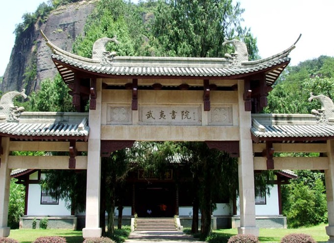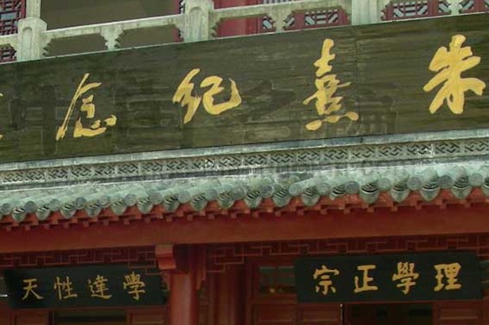 造型莊重、嚴謹的武夷山朱熹紀念館,是一座于1990年落成的廡殿式大院。館內懸掛著新近書寫的匾額、楹聯,其中有不少聯文,語言精練、寓意深長,文彩斐然。古樸的大門上高懸著一塊大匾,題為“朱熹紀念館”五個醒目大字。是方毅同志在武夷山視察時留下的墨寶,莊重、蒼勁,有書法大家的風范。朱熹在武夷山講學40余年,繼承和發展了理學體系。殿前大門兩側的草書楹聯表達了朱熹繼承和發展的深邃意義。
