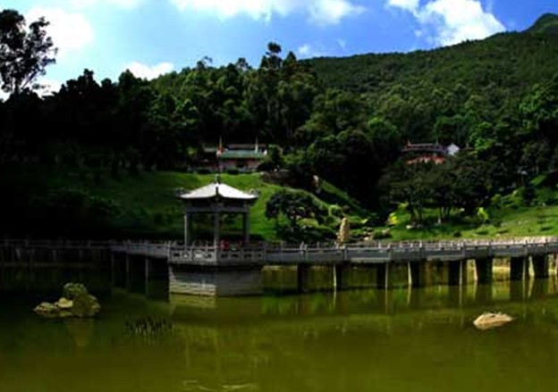 位于惠東縣平山東南4公里處,因有九條山脊似和條龍而得名。這里有以譚公祖廟為中心的大小10余座廟亭和動人的神話故事,傳說六百多年前,譚公童年在此放牛,后得道成仙,后人為紀念他而建造廟亭,祖廟始建于元代未年,清道光三年重修,廟內建筑畫棟雕粱,精致優美,大門有一對石獅,一副對聯“聲動虎蛇龜盡伏,功施風雨露無偏。”