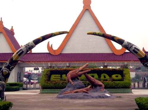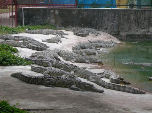 島那金碧輝煌,巍峨壯麗的泰式門樓,門前寬廣的停車場可一次性停放上百輛大巴,進(jìn)入大門后,有一個(gè)十分醒目、高達(dá)4米的大型鱷魚雕像——“鱷魚一家”吸收不少游客紛紛在此攝影留念,離雕像百米處,十多個(gè)鱷魚池座落在鮮花叢中、綠茵地上、池中養(yǎng)有我們祖先稱為“噴火龍”、“鮫龍”的楊子鱷、泰國灣鱷、馬來鱷、雜交鱷等四個(gè)品種,大小近千條,最小的有剛出殼的幼鱷,體型最大的有4米多長,重達(dá)千斤。此外還養(yǎng)有一批鴕鳥、狗熊、孔雀、猴子、大蟒蛇、駱駝、驃頭大馬供游人觀賞、合照,大仿古大炮、踏水車、水上單車等有獎(jiǎng)娛樂項(xiàng)目供游人玩樂。