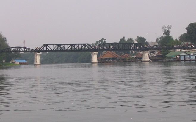桂河大橋原為木橋,幾經飛機轟炸,早已毀壞,只有在河水很淺時才能看到殘跡,現在我們看到的是后來修建的鐵橋,它今天還在通車。重建后的桂河大橋,在原來橋的兩側圓弧鐵架多出了兩段不協調的方形鐵架,沒有原先圓弧鐵架的優美,很多看過的人覺得不倫不類、不搭調。桂河大橋大約10分鐘就可以走完,過了橋就是一般的死亡鐵路,一直前行可以通到緬甸。站在桂河大橋的橋頭,看著夕陽下靜靜流淌的美麗桂河,使人難以想象這里發生過的悲慘故事,只有安放在橋頭的美軍投下未爆炸的炸彈提示著我們當年那場慘烈的戰爭。