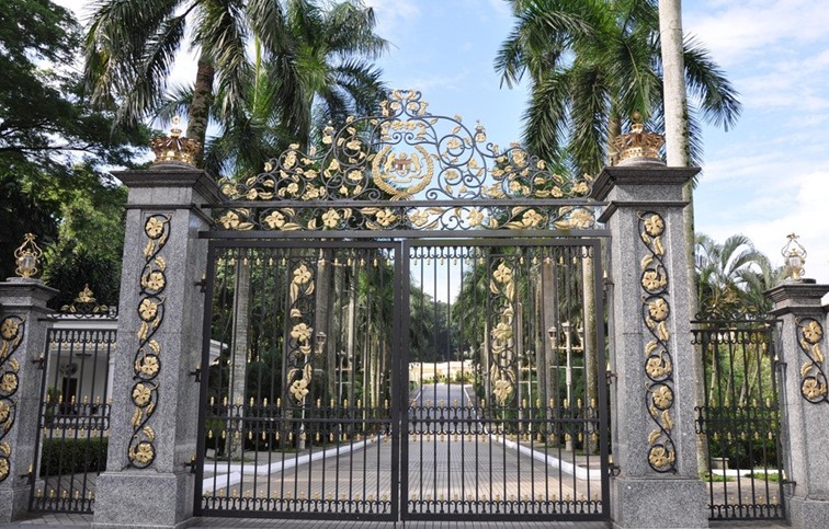 國(guó)家皇宮坐落在吉隆坡的一座小山丘上,雖沒(méi)有其他大國(guó)的皇宮建筑的宏大氣派,但卻有著皇宮一如既往的輝煌與莊嚴(yán)。在平常的時(shí)期,皇宮并不對(duì)外開(kāi)放,所有的游客只能在皇宮門(mén)口欣賞整個(gè)皇宮的華麗。簡(jiǎn)單的皇宮門(mén)口是由一扇并不是很寬敞的鐵門(mén)與旁邊的小崗?fù)づc小門(mén)洞組成。僅僅就這一小片風(fēng)景,就讓游客迷戀不已。鐵門(mén)是用黑色作底色,襯以金黃色作為裝飾,典雅大方,從嚴(yán)肅中透出一種高貴。在鐵門(mén)的側(cè)邊的崗樓和崗樓旁的門(mén)洞中,各有一名哨兵站崗,在崗樓中的哨兵身穿白色上衣配有綠色前裙的制服,手持長(zhǎng)槍;在門(mén)洞中的哨兵,則穿一件紅色上衣,黑色長(zhǎng)褲,胯下騎一匹黑色高馬,威風(fēng)凜凜,常常吸引無(wú)數(shù)鏡頭。