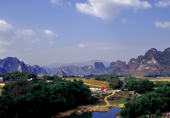 榮強(qiáng)小桂林距九龍鎮(zhèn)南一公里,群峰拔地而起,峰間小河碧水,兩岸鳳尾竹隨風(fēng)搖曳,青峰倒影其中,真似“山如碧玉簪、江作青羅帶”的桂林旖旎風(fēng)光。