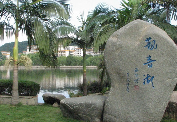 觀音嶺位于碣石鎮北與金廂交界之處,因嶺上有觀音禪淙堂(水月宮)而得名。嶺下海灘長達8km,海中距岸lOOm處水深才1,5m,距岸200m水深2m。沙白、水清、浪小,是一個理想的天然游泳海灘。嶺前奇山眾多,有周恩來、葉挺同志當年搶渡香港下海處的龍石,汕尾市境內最大的摩嶺刻“鎮海石”,明欽差大臣成大猷、鄭岳山刻“鎮海石”,“揚威止水”于鎮海石上。該處以“神、海、沙、石”兼備而聞名,中國書法家協會主席啟功先生題“粵東旅游黃金海岸”于石上。