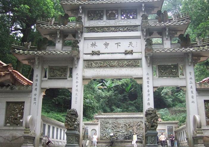 據(jù)明萬(wàn)歷《曹溪通志》記載:南朝梁武帝天監(jiān)元年,印度高僧菩提達(dá)摩東土弘法,歷經(jīng)三年海上航行,首站登陸嶺南。見(jiàn)此地“山水匯合,峰巒奇秀,嘆如西天寶林山也”,遂建議地方官奏請(qǐng)武帝建寺。天監(jiān)三年(公元504年),寺廟建成,梁武帝賜額“寶林寺”。唐儀鳳二年(公元677年)始,中國(guó)佛教禪宗創(chuàng)始人六祖惠能大師來(lái)寶林寺說(shuō)法37載,使南宗禪法大播于天下。故南華寺素有南禪祖庭之稱,還與嵩山少林寺并稱為禪宗祖庭,在東南亞、朝鮮、韓國(guó)、日本以及歐美等國(guó)家和地區(qū)有重要影響。武則天萬(wàn)歲通天元年(公元696年),武則天賜慧能水晶缽盂、磨衲袈裟等物。唐神龍?jiān)辏ü?05年),中宗又賜寶缽、磨衲袈裟等物,并將寺名賜改為“中興寺”;神龍三年(公元707年)再改“法泉寺”。宋開寶元年(968),太祖賜額改稱“南華禪寺”,沿稱至今。1983年,南華寺被確定為全國(guó)重點(diǎn)寺廟。今南華寺占地總面積約42.5萬(wàn)平方米,主體建筑群總面積1.2萬(wàn)平方米。為階梯式中軸線對(duì)稱平面布局。寺向?yàn)樽背稀V休S線上由南至北依次為曹溪門(頭山門)、放生池(上筑五香亭)、寶林門(二山門)、天王殿、大雄寶殿、藏經(jīng)閣、靈照塔、祖殿、方丈室。自天王殿始作封閉,東側(cè)依次為鐘樓、客堂、伽藍(lán)殿、齋堂等;西側(cè)依次為鼓樓、祖師殿、功德堂(亦稱西歸堂)、禪堂、僧伽培訓(xùn)班等。主體建筑院落外,北側(cè)有卓錫泉(俗名九龍泉)、伏虎亭、飛錫橋;西側(cè)有無(wú)盡庵、海會(huì)塔、虛云和尚舍利塔;東側(cè)有中山亭。