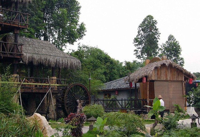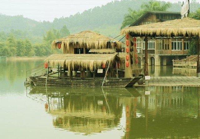 極目莊園方圓幾百畝,百畝水面,風(fēng)平如鏡,或銀波閃爍,或迂回於幽篁之中,或穿行於絲柳之側(cè),亭閣倒影似蜃樓海市,葉葉扁舟如散花點點,裝一船歡歌,載一家笑語,天倫之樂不亦悅乎!籍田園風(fēng)光之茅屋草寮星羅棋布於全園,皆取法乎自然。或傍水,或依山,或掩蔭於翠竹之下,或深藏於幽徑之中,置身其中,恍若隔世桃源,疑是玉宇瓊臺。