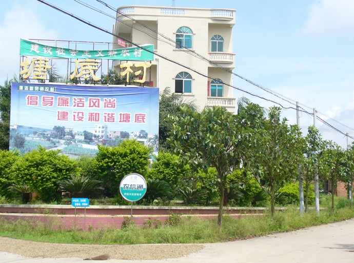 塘底村地處新民鎮(zhèn)西北部,全村現(xiàn)有人口1182人,耕地面積490畝,種果面積450畝,2005年實(shí)現(xiàn)人均純收入達(dá)3000多元。近年來,該村致力把村容、村貌環(huán)境建設(shè)作為新時(shí)期農(nóng)村工作的首要任務(wù)來抓好,高標(biāo)準(zhǔn)、高起點(diǎn)建起了初具規(guī)模的生態(tài)文明新農(nóng)村。至2005年底止,全村共投資280多萬無,清除雜竹1200多叢,28000多根,清理雜屋80多間,1500多平方米,推土8000多立方米,填污水塘5個(gè),建設(shè)環(huán)村道5.8公里,建設(shè)文化樓一幢,燈光球場一個(gè),大舞臺(tái)一個(gè),種植大王椰108棵、蘇鐵106棵、黃金梅球88個(gè)、黃皮果苗1600株、草皮1000平方米,綠化面積達(dá)3900平方米,房屋門前硬底化面積3500平方米,從而使整個(gè)村莊的精神面貌煥然一新。該村在抓好生態(tài)文明村建設(shè)的同時(shí),著力抓好社會(huì)治安綜合治理和民主法制教育以及反腐倡廉教育,村中無打架、斗毆、吸毒、賭博,無重大刑事案件發(fā)生。近年來,該村先后被授予廣東省文明村、廉江市生態(tài)文明村、無毒社區(qū)、安全文明小區(qū)和湛江市優(yōu)秀安全文明小區(qū)、湛江市民主法治示范村等光榮稱號(hào),是省、市反腐倡廉教育進(jìn)農(nóng)村示范點(diǎn)。