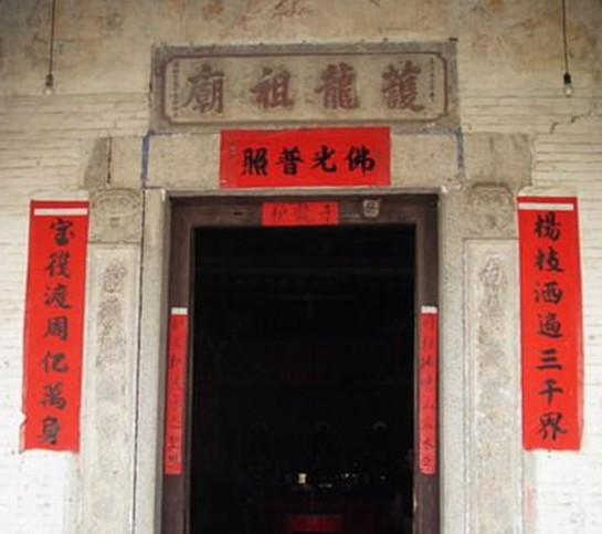 護龍祖廟在端州區(qū)黃崗鎮(zhèn)前村,始建于清初,同治十年(1871)重修。四周古樹懷抱,環(huán)境清幽,有小溪潺潺流過,廟前遠眺,田園秀色一覽無遺。廟為三進院落四合院式布局,面積136平方米,大門上方鑲嵌楷書“護龍祖廟”石匾,前后殿為硬山頂,面寬進深均三間,建筑物前設“低頭牽”,抬梁與穿十混合式梁架結構,兩殿之間以平面方形的卷棚頂廟亭相連,亭兩側空地邊緣,還用矮墻連貫前殿與后殿,使之渾然一體。
