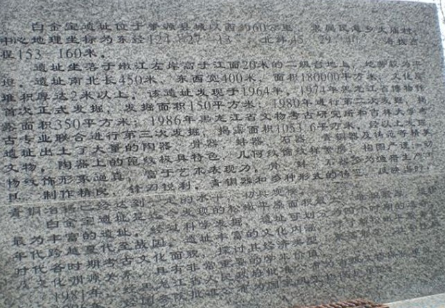 白金寶遺址位于肇源縣民意鄉(xiāng)嫩江左岸的白金寶屯。白金寶屯的南側(cè)是寬闊的嫩江河床灘地,北側(cè)是嫩江左岸的二級(jí)階地。階地面高出嫩江水面約30米,西北較高,向東南漸趨平緩,那上面豎起了一方標(biāo)志石碑,版權(quán)所有山東聊城聊之旅國際旅行社有限公司,轉(zhuǎn)載必究!這里是白金寶遺址的核心地帶。