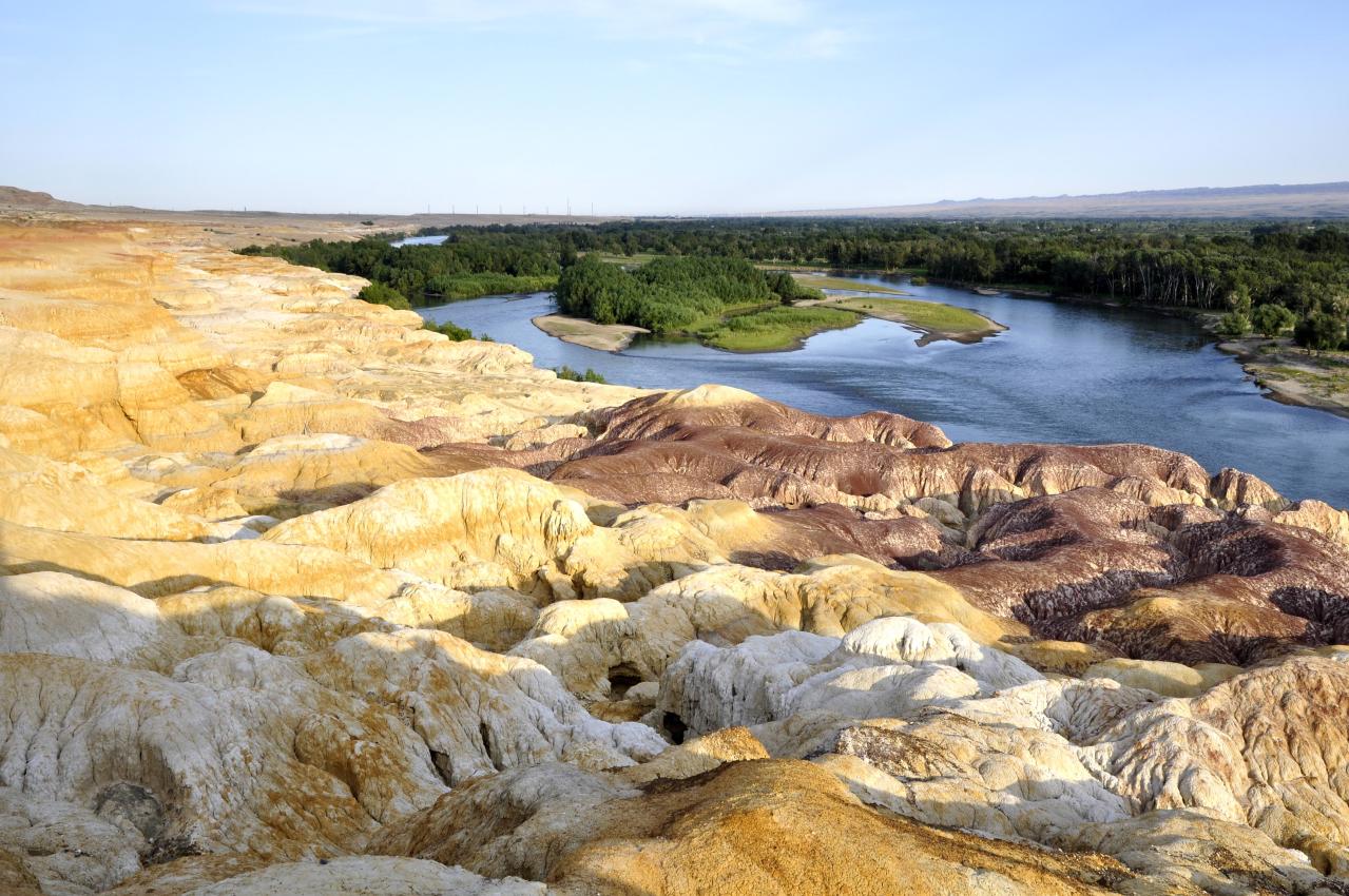 五彩灘位于布爾津縣城以北約24公里處,是前往哈巴河縣與喀納斯的必經(jīng)之路。它毗鄰碧波蕩漾的額爾齊斯河,與對(duì)岸蔥郁青翠的河谷風(fēng)光遙相輝映,可謂“一河隔兩岸,自有兩重天”。激猛的河流沖擊以及狂風(fēng)侵蝕,形成了北岸的懸崖式雅丹地貌,河岸巖層抗風(fēng)化能力強(qiáng)弱不一,輪廓便會(huì)參差不齊,而巖石含有礦物質(zhì)的不同,又幻化出種種異彩,因此得名“五彩灘”。 版權(quán)所有聊城聊之旅國際旅行社有限公司,轉(zhuǎn)載必究!而南岸卻是綠樹葳蕤,連綿成林,遠(yuǎn)處逶迤的山巒與戈壁風(fēng)光盡收眼底。