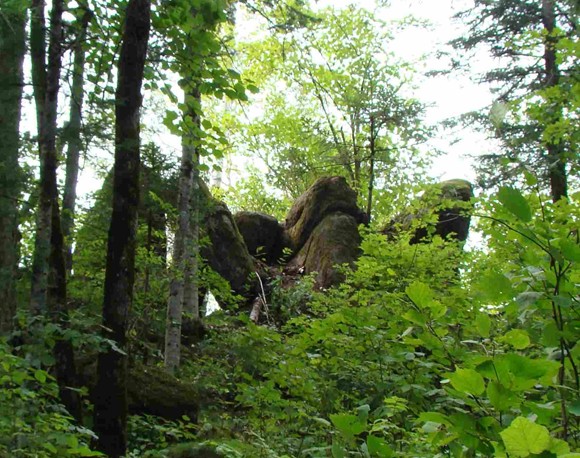 位于距市區(qū)7公里處。在一片密林中,有一簇平地拔地而起,以一塊塊花崗巖巨石砌成的石峰,高大雄偉,其形似柱,稱謂石林。石林由六座石峰組成,南二北四。北面四座一字梯形排列,一高近丈,二高近二丈,三高平二丈,四高一丈半。二峰端長有蒼松一株,似示最高。各峰成形惟妙,二三座石峰間相距極狹,僅尺許,縫如刀切,稱“一線天”。在第四座石峰南5米處,還有兩座石峰,相距不足1米,微低。