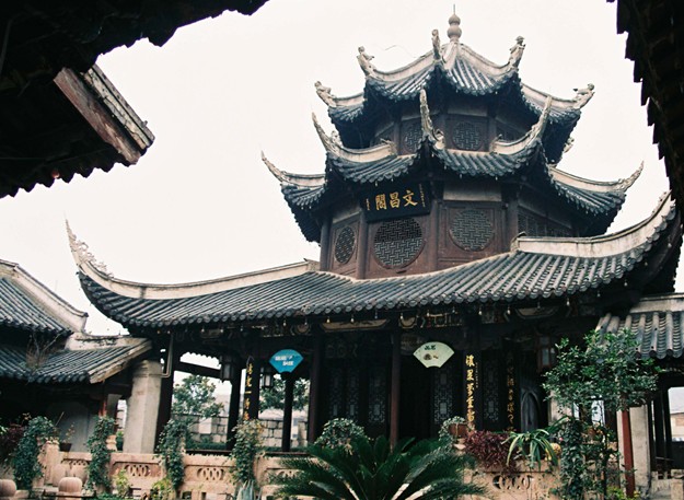 文昌閣,位于貴陽城區東隅,始建于明萬歷三十七年(1609年),占地1200平方米,以設計巧妙、結構獨特而著名,是省級重點文物保護單位。道教廟宇。在貴州省貴陽市東門月城上。始建于明代萬歷三十七年 1609),清代康熙八年(1669)重修,雍正、乾隆、嘉慶、道光時均有維修和擴建。該閣是一座九角三層寶塔形建筑,兩邊設有配殿,前為聯結配殿的齋房,平面布局成四合院形。主樓高約20米,面闊11.47米,進深11.58米,為三層三檐、不等邊九角攢尖頂,各層插拱較多,斗呈曲線,翹角不高,窗花和枋板施有彩繪,其建筑風格頗具地方特色。原為供奉文昌帝君之所,現是貴陽文物保護單位。