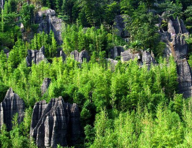 綠色石林地處貴州省貴陽(yáng)市修文縣,占地1000多畝。景區(qū)內(nèi)眾多奇峰怪石拔地而起,似劍如戟,破土直刺蒼穹。石峰最高達(dá)30余米,又有地峽石罅幽深曲折。因綠樹(shù)古藤、蟠枝虬根常年攀附石峰,使石林平添了幾許柔情,獲得了“綠色”石林的美譽(yù)。又因它造型迥異的石形而贏得了“擬態(tài)動(dòng)物園”的美名。