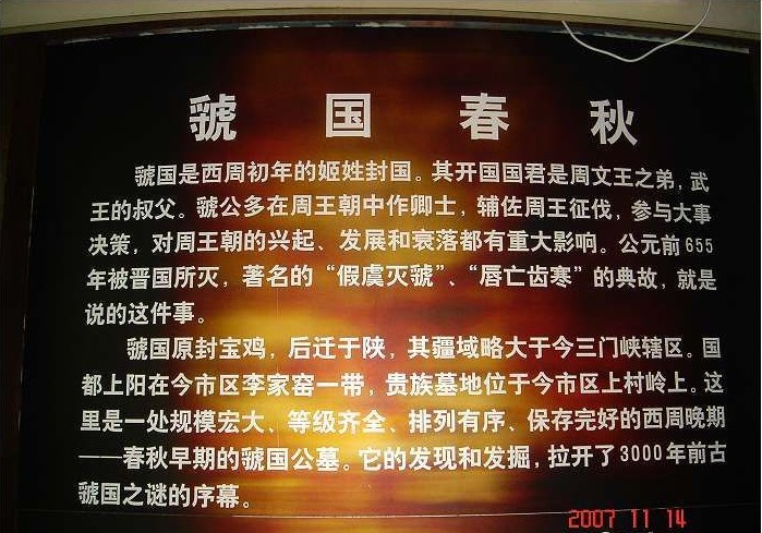 虢國(guó)是西周初年的姬姓封國(guó)。其開國(guó)國(guó)君是周文王之弟,武王的叔父。虢公多在周王朝中作卿士,輔佐周王征伐,參與大事決策,對(duì)周王朝的興起、發(fā)展和衰落都有重大影響。公元前655年被晉國(guó)所滅,著名的"假虞滅虢"、"唇亡齒寒"的典故,就是說(shuō)的這件事。