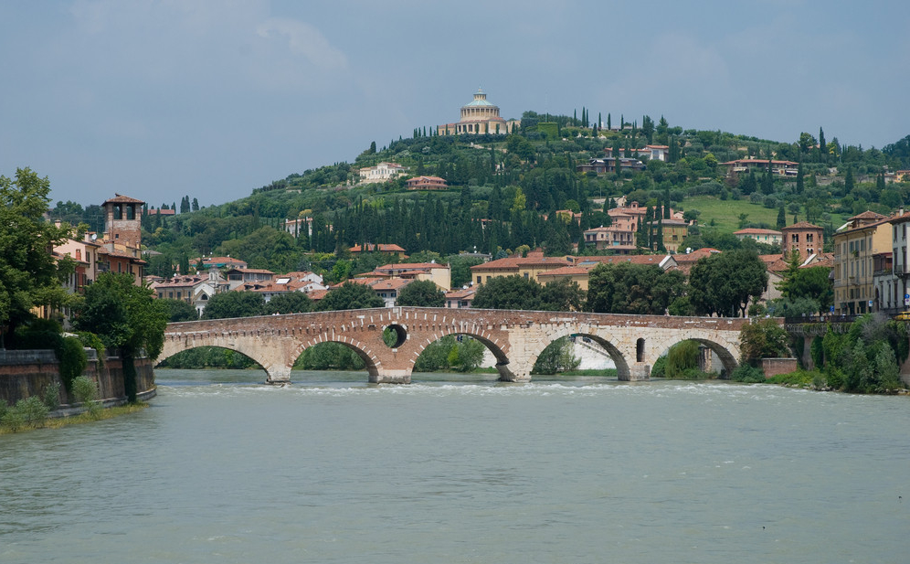 維羅納北靠阿爾卑斯山,西臨經(jīng)濟(jì)重鎮(zhèn)米蘭,東接水城威尼斯,南通首都羅馬,自古就是一個(gè)兵家必爭(zhēng)的軍事要塞,同時(shí)也是意大利和歐洲鐵路、公路相連通的主要樞紐,因此有意大利的門戶之稱。