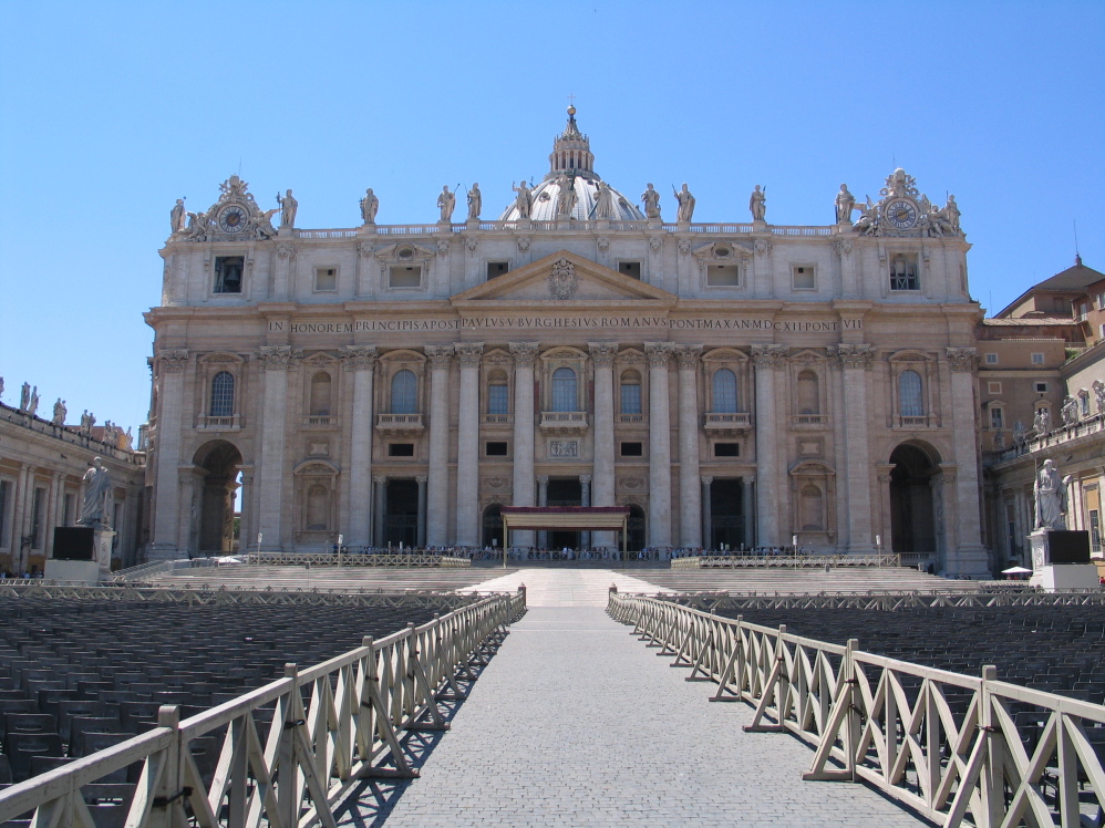 兩千年前的簡單墓地,四百年后修建了一座長方形會堂,后來毀于戰亂,一千年后尼古拉五世頒發重建命令,之后就是長達120年的重建,先后由意大利最優秀的建筑師住持設計施工,布拉曼特來了,米開朗琪羅來了,德拉?波爾塔來了,卡洛?馬泰爾也來了。1626年11月18日正式宣告落成,一臉肅穆的教皇烏爾班八世主持落成典禮。