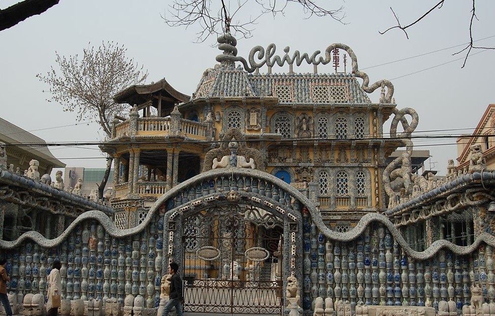 它將傳統元素與具有中國文化韻味的元素巧妙地糅合起來,比如:圍墻是“平安墻”,用的是大小不一的瓷瓶粘貼,取諧音“瓶”安墻而來。石造像、漢白玉石雕會在恰當的時候與瓷片形成趣味組合,代表著時來運轉(諧音“石”)。