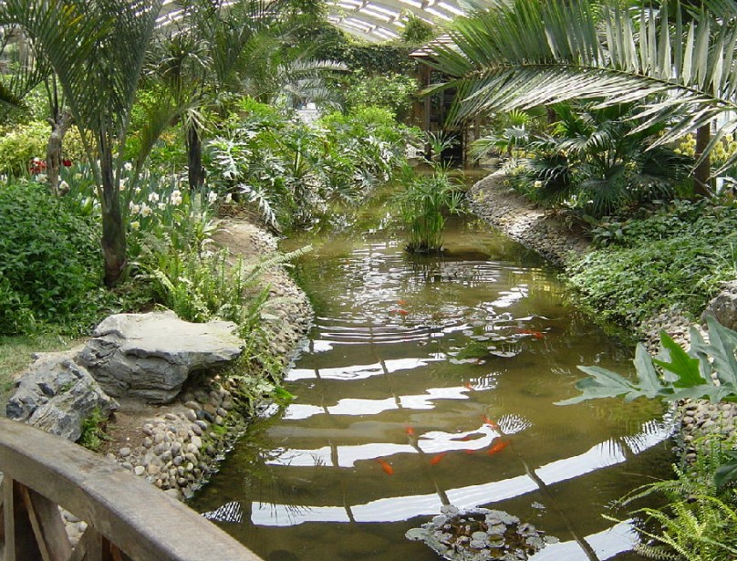 位于公園中部,溪流到此處寬狹不等,曲折多變。河兩岸群植竹、杉及灌木,河邊楊柳飄絲,南岸樹叢中隱現一只面積18.5平方米的竹亭。北岸有座呈直角形的綠蔭茶室,墻體為毛石砌就,外形樸素、粗獷,部分建筑伸出水面,有竹甬道與岸相聯,建筑面積350.25平方米。室內設裝飾壁爐,墻上懸掛獸頭鹿角,野趣盎然。景區南有座三孔石拱橋,長13米,寬3.1米;橋上的花崗石亭面積10平方米。過橋向西有組蘑菇亭,混合結構,面積共30.6平方米,亭下配有石桌石凳。