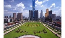 天河東站綠化廣場位于廣州市新城市軸線上,占地面積4.7萬平方米,于1998年9月中旬動工,1999年7月1日正式完成并交付使用。廣場中央綠地2.6萬平方米,鋪種馬尼拉草18315平方米,其中有6000平方米種植標志性的紋樣,分圍種植1300平方米的福建茶綠籬。中央草坪四周設(shè)有41個花池,24個柵池,24個花缽,廣場綠化率達82%。仿南越王墓制式花壇,遍植各種嶺南花卉。